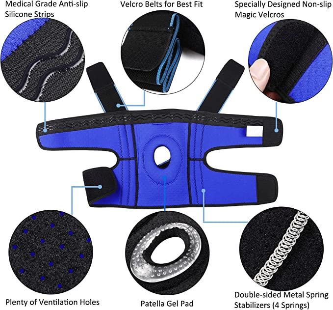 2 Extra Adjustable Velcro Straps and 2 Specially Designed Velcro Fixing Systems for Best Fit, Four Spring Stabilizers and Open Patella Design. Medical Grade Silicone Non-slip Strips and Large Area of Vents, Breathable and Sweat-absorbent, No Allergies and Itchiness. - 4 Sizes