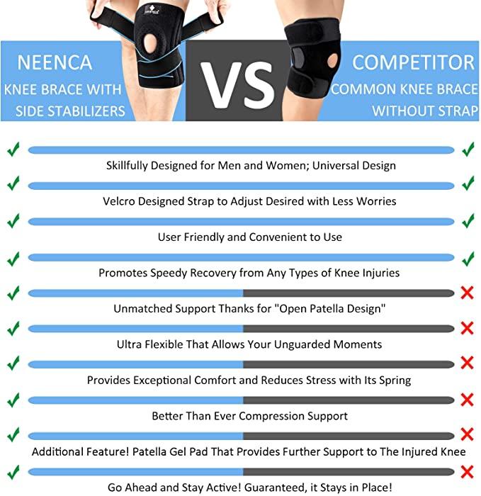 NEENCA KNEE SUPPORT TECHNOLOGY— An anatomically contoured patella gel pads surrounds the kneecap, double-sided metal spring stabilizers(4 springs) fit tightly with your knee joint. These special functional element strengthen side support and maintains joint stability. It effectively disperses pressure, keeping your knee warm, lubricating your joints. It's the BEST CHOICE for sports protection and pain recovery.