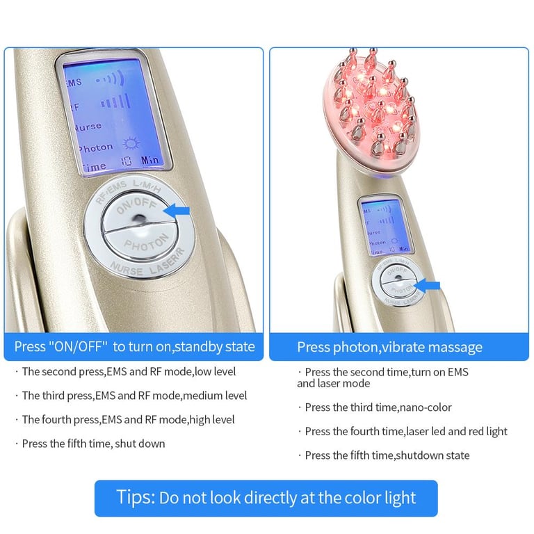1.7 In 1 Innovated Technology:Infrared light, low-frequency RF, nano red light, electroporation, EMS micro-electricity, vibration massage, and RF. 2.Combined action of 3 beams of light plus a massage function significantly increases hair strength, improves hair quality and stops hair loss 3.Help to promote blood circle, relax and fatigue relief. Frequent use can prevent from headache or intermittent headache 4.Stop hair loss and makes hair grow thicker, stronger and healthier 5.Spectacular advance in Home Hair Treatment with Laser 6.Combines Laser Photo Therapy that sends nourishing, Low Level Laser Light Energy into your hair with Bio Stimulating Vibration Technology to stimulate circulation 7.Light is adopted to clean your hair root and makes hair smooth and healthy. For best results, use 10 minutes every other day