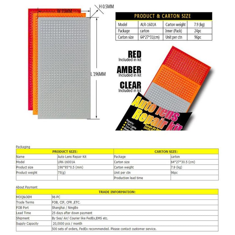 Multi-pack repair kit comes with 3 colors, red, amber and clear.