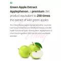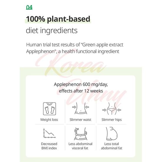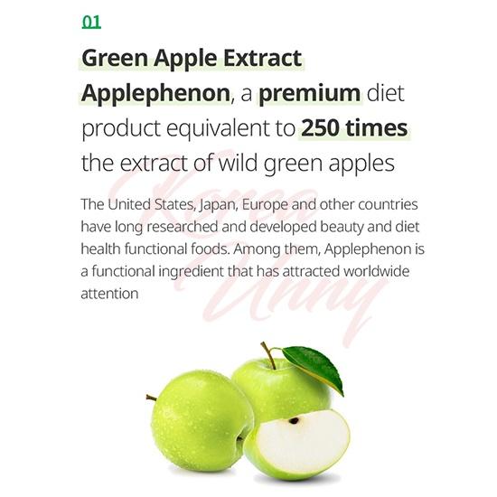 1️⃣ Excellent diet ingredient!• 250 times polyphenol and green apple extract concentration compared to wild green apples• Safe plant-based material2️⃣ 2 sticks per day = total polyphenol of 45pcs green apples• Contains 600mg of applephenon and green apple extract3️⃣ 100% vegetarian ingredients• Human body test results showed significant reduction after 12 weeks of consistent intake• Works even better with exercise and proper diet4️⃣ Healthy and safe taste• No artificial taste• Uses fructooligosaccharide instead of sugar5️⃣ Convenient packaging, consume anytime anywhere