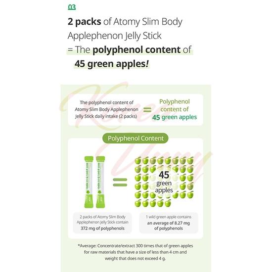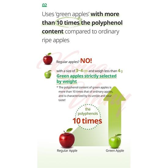 What makes Applephenon Jelly Stick irresistible? Only uses selected green apples that meet the requirements of small size (3-4cm) and less than 4g Contains 10 TIMES more polyphenol than regular apples