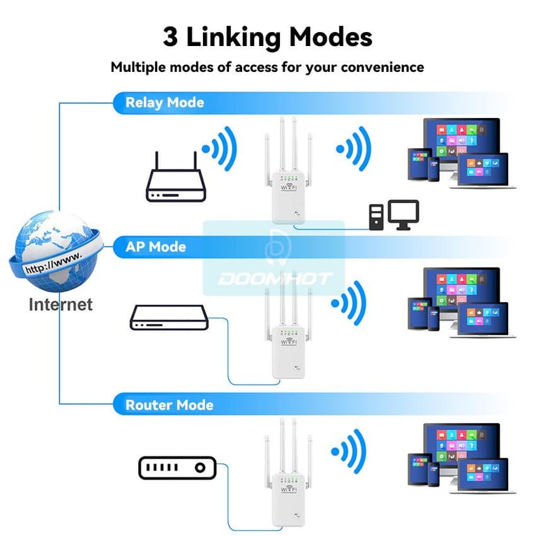 - 3 Modes: Includes relay, AP, and routing modes,providing stronger wireless performance and coverage, AP mode creates a new WiFi access point, A LAN port allows you connect any wired devices, which can easily meet different needs.