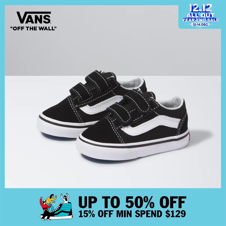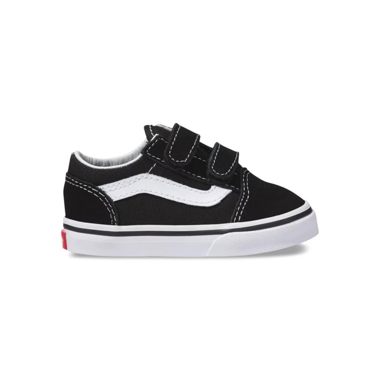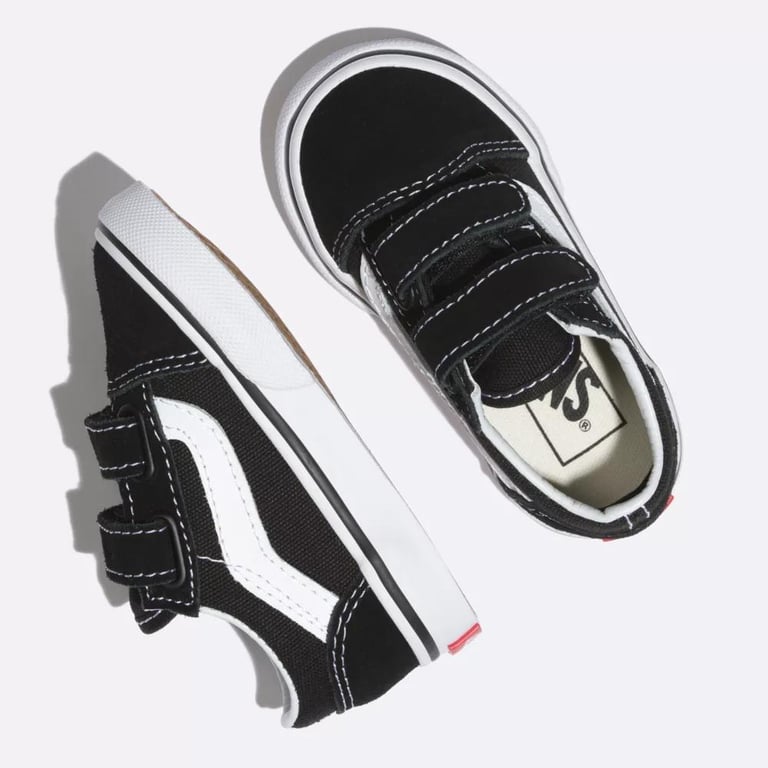 The Old Skool V, inspired by the Vans classic skate shoe, features a low profile silhouette with sturdy canvas and suede uppers, hook-and-loop closures, padded collars for support and flexibility, and signature rubber waffle outsoles.