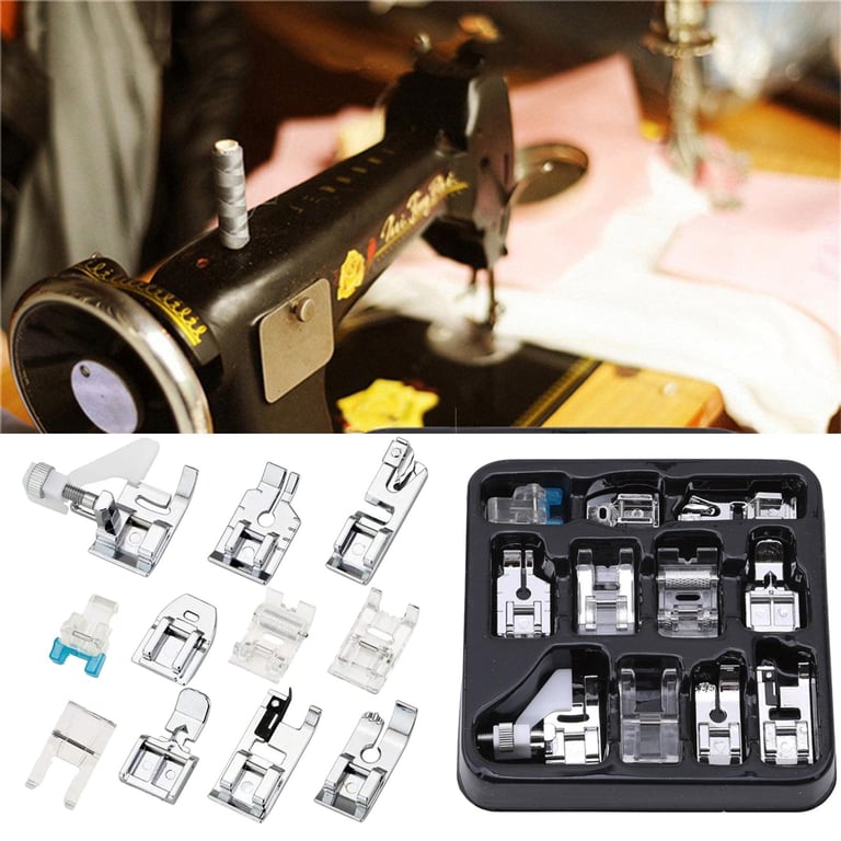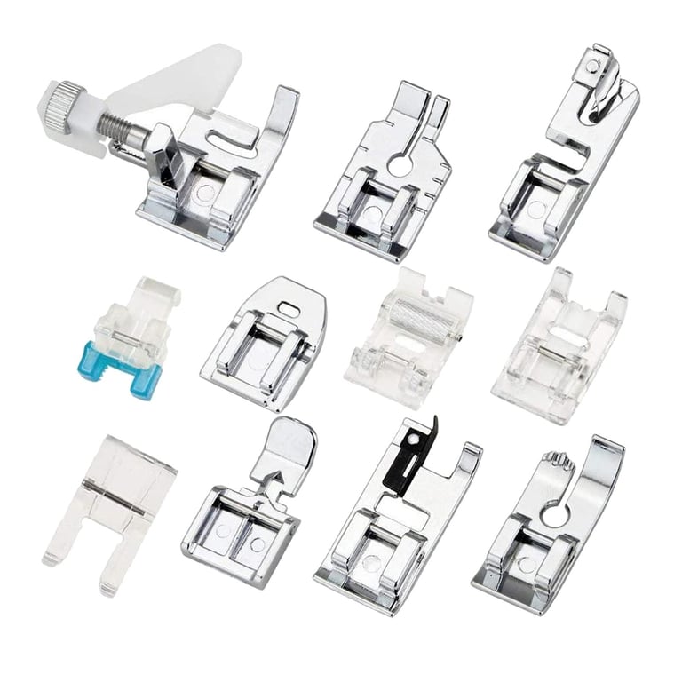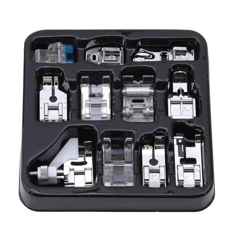 Presser Foot Included:Nail Button Pressing Foot,Invisible Zipper Foot,3mm Narrow Edge Presser Foot,1/4inch Quilting Foot,Satin stitch Foot,Roller Foot,Zipper Foot,Blind Stitch Foot,Open Toe Embroidery Foot,Straight Stitch Foot,Sewing Presser Foot