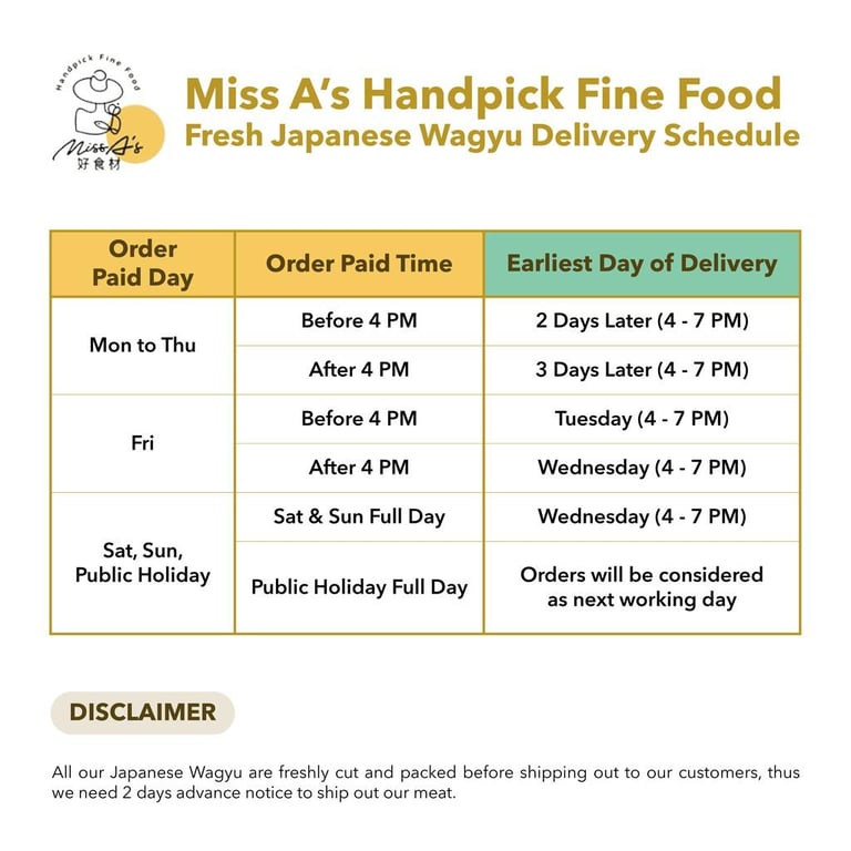 Hokkaido Wagyu Beef Yakiniku 北海道雪花和牛小排 无添加 无抗生素 无生长激素 自然饲养 产地: 日本/ Japan 雪花级别 / Marbling: A5 Grain-Fed 谷饲 净重 / Weight: 200g 冷藏食用 / 0-3 degree: 7 天/Days 冰冻保鲜期: 生产日期后6个月 Kept Frozen at -18 Degree: 6 Months from Production Date A5 grade with premium marbling and fine texture. Intramuscular fats provide a rich and nutty flavor while keeping the meat tender and moist. Great choice for BBQ. A5品级牛排,含有最高等级的脂肪分布 烹饪时内在油脂的融化赋予牛排极为丰富的风味和香气 保持肉块的鲜嫩多汁 是烧肉的极佳选择 Miss A’s Handpick Fine Food Delivery Schedule: (1) Order paid on Monday to Thursday- Before 4pm —> Next day delivery between 4-7pm- After 4pm —> 2 Days later between 4-7pm (2) Order paid on Friday- Before 4pm —> Saturday delivery between 4-7pm- After 4pm —> Monday delivery between 4-7pm (3) Order paid on Saturday & Sunday —> Delivery on Tuesday between 4-7pm (4) Ordered Paid on Public Holiday —> 2 Days later between 4-7pm * Delivery schedule above reflects Earliest Day of Delivery * We will follow the delivery schedule, unless a later date is requested in the remark after order is placed