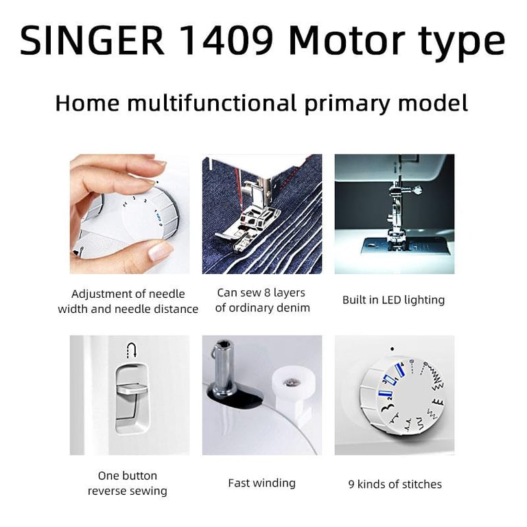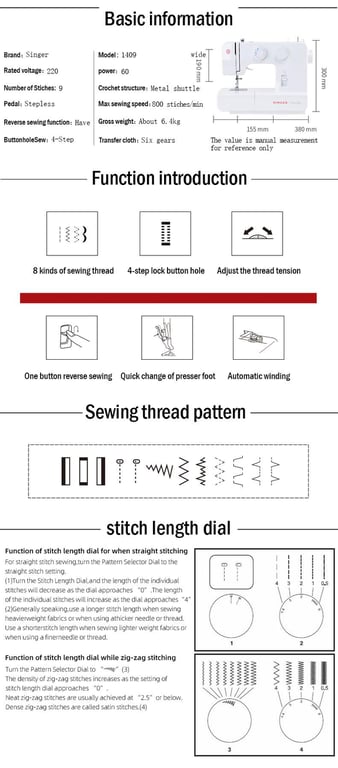 Highlights:9 automatic stitches800 stitches per minuteMotorised 70 watts2 needle positionsAutomatic bobbin winding4-step buttonholeEmbroidery featureZipper insertionTwin needle capabilityPush lever reverseStitch pattern indicatorStitch length control dialer (1409 upgraded feature)Accessories included: all purpose foot, zipper foot, buttonhole foot, button sewing foot, edge/quilting guide, darning plate, spool cap holders, screwdriver, bobbins, needles, lintbrush/seam ripper and oil bottle. Free sewing platform.Weight 6.5KgSize H38x W46.5 x L24.5 cmValue package with more practical accessories,welcome to buy our products.1 year warranty