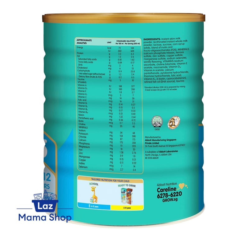 Abbott GROW milk powder for school-going children is formulated to provide essential nutrients to support their overall growth and development. GROW School is scientifically formulated to support the nutritional needs of your child in their formative years. Brain Development: DHA is an important building block for the development of brain and eyes. Growth: Calcium helps to support development of strong bones and teeth. Vitamin D helps support Calcium absorption and improves bone strength. Immunity: Antioxidant system with Zinc, Vitamins C and E to help protect cells from free radicals. Iron and Zinc are necessary for normal immune function. Unique vegetable fat blend with No Palm Oil. GROW is a Healthier Choice product which is lower in saturated fat and higher in calcium.