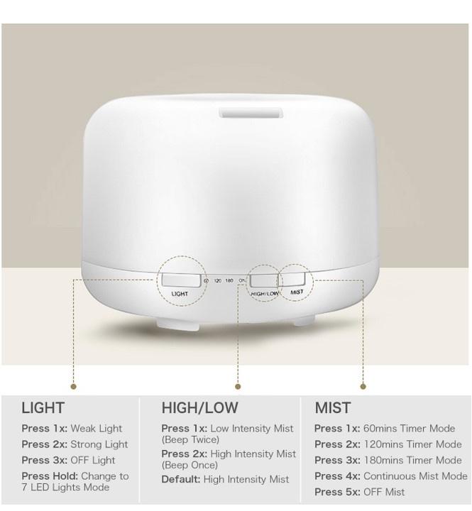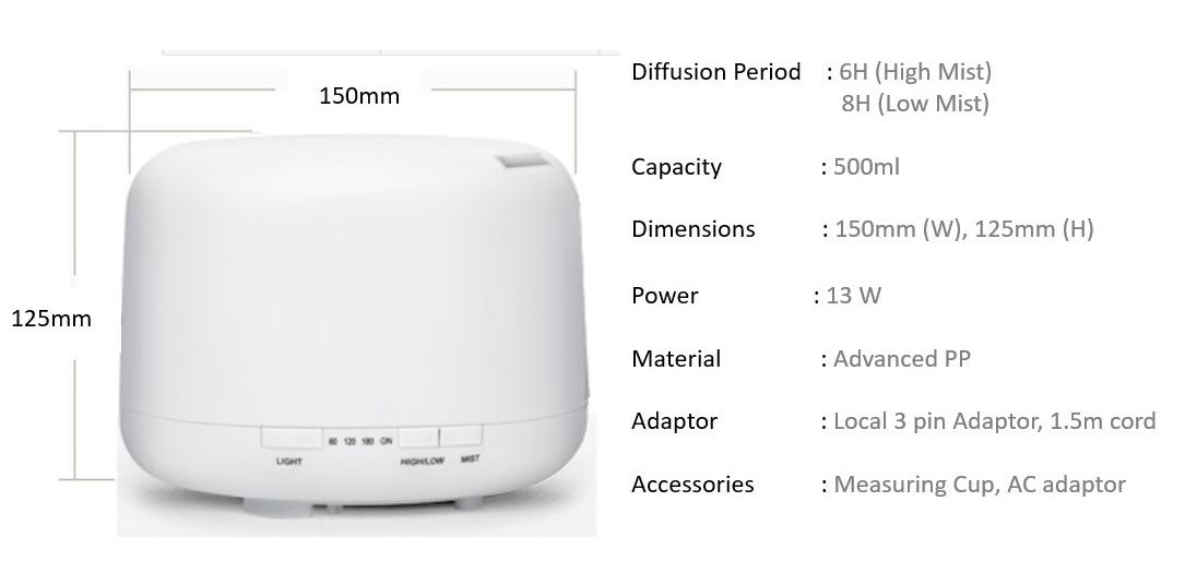 Moisturises and refreshes your living space Package Includes: - 1x Aroma Diffuser/ Humidifier (500ML/300ML) - 1x Charger (3 pin SG plug) No Meauring cup!