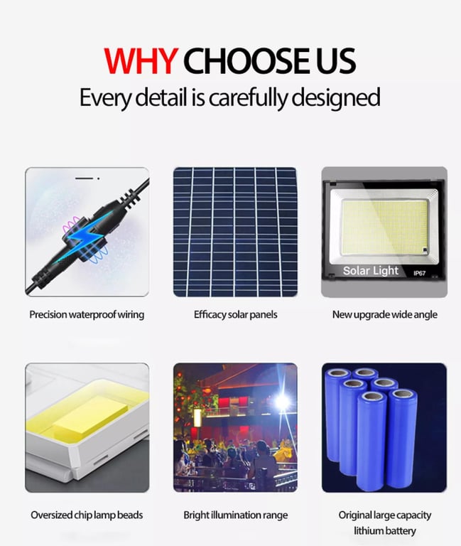 [New upgrade]: Using the latest 5730LED lamp beads, the light is uniform, the overall brightness is significantly improved, and the lighting area is more extensive! Monocrystalline silicon solar panels increase the charging efficiency by 15%, are smaller, and are more convenient and safer to transport. The 5M ultra-long copper cable has low loss and fast conversion speed! Standby time is as long as 6-12 hours. Excellent workmanship and high-quality materials can make your house light up every night.