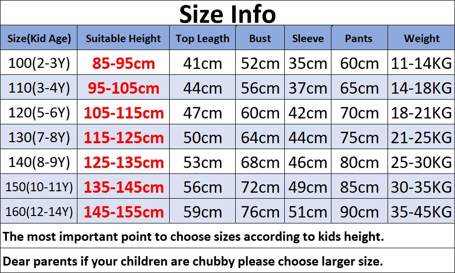 Please note the sizes for it doesn't fit all people. Please view the details of the size information before your purchase.Dear Parents if your children are chubby please choose larger size.Products include: 1*Tops +1* PantsNotes: 1-2 cm error of measuring is reasonable range due to different measurementmethods.